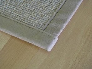 Serging a carpet involves continuously wrapping the edge of the carpet with yarn. This is similar to a traditional whip stitch, except the yarn on the edge is very close together and done by a machine. The width of the serging is about 3/8” and the yarn is chosen to match the carpet.